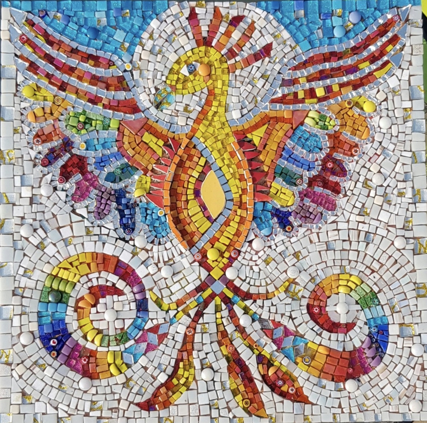 Dawn Handy has created a beautiful mosaic, Rising Phoenix, which will be in the TWAS exhibition, as part of the TWAS project at the Yeovil Art Space. Handcut vitreous tiles, mirror glass and crockery with some millefiori and round elements. The theme of the exhibition is resilience and Dawn feels that a phoenix embodies the stoicism and tenacity that we all need at present. It represents rebirth and hope for a better future.