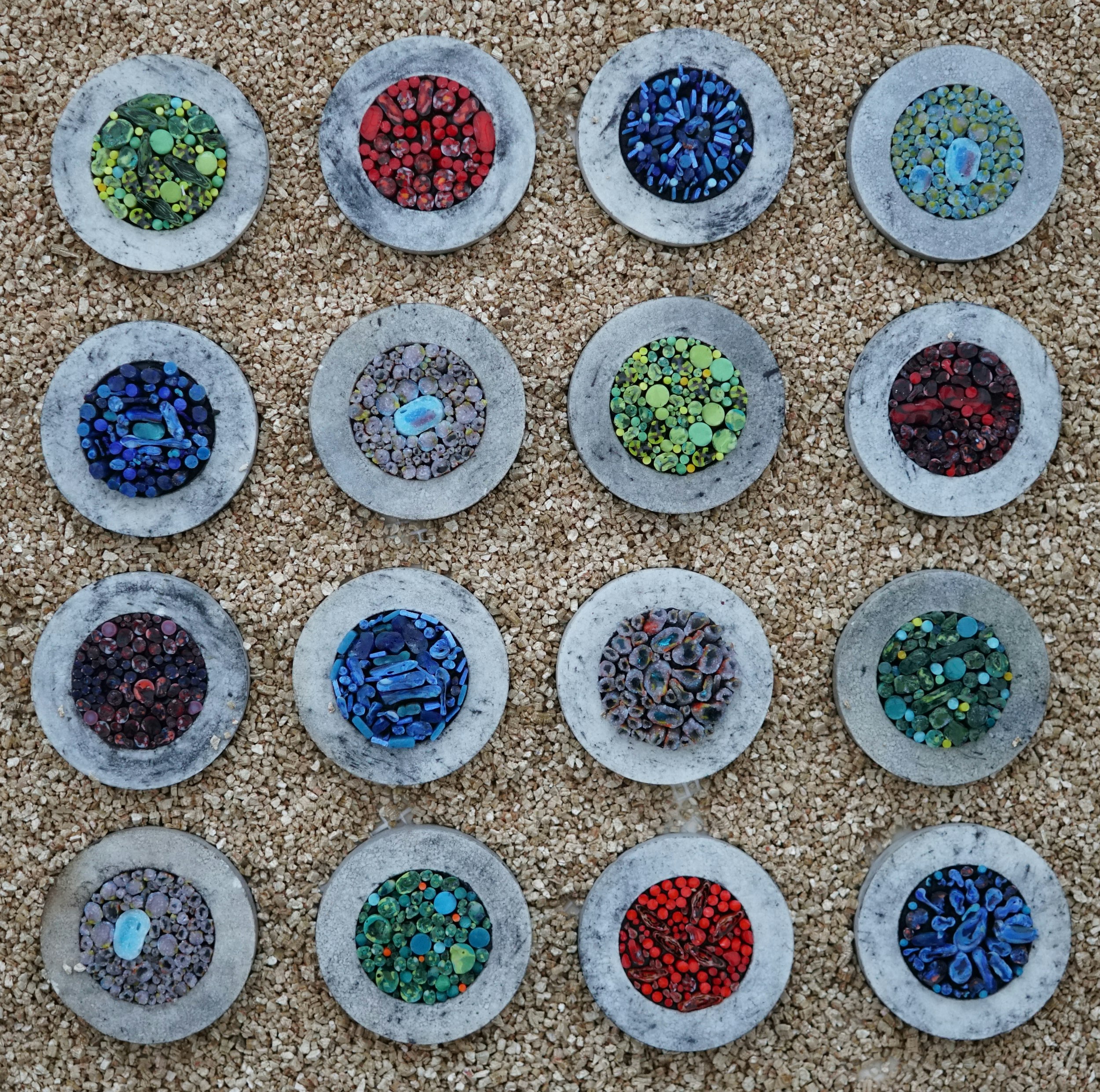 The four artists used similar bases for the mosaics, little ceramic rings provided by Rachel Sager, the owner of the location in the USA, although they all chose a different colour for their work.