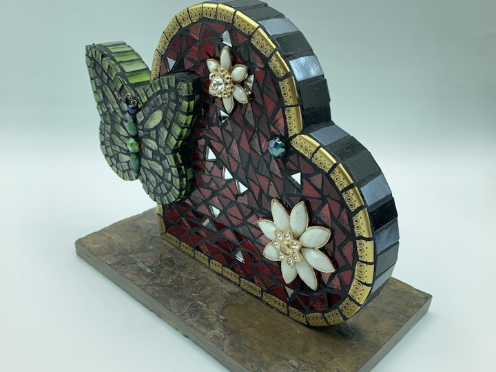 The idea of repurposing things that would be thrown away and end in landfill is very appealing and he enjoys the freedom of expression that the technique of mosaic allows and the fact he is able to introduce vibrant colour and reflective qualities into 3D work. David has work in public and numerous private collections and his aim and desire is to produce work that is tactile, visual and stimulating to the human senses.