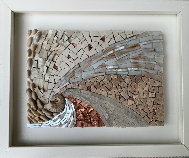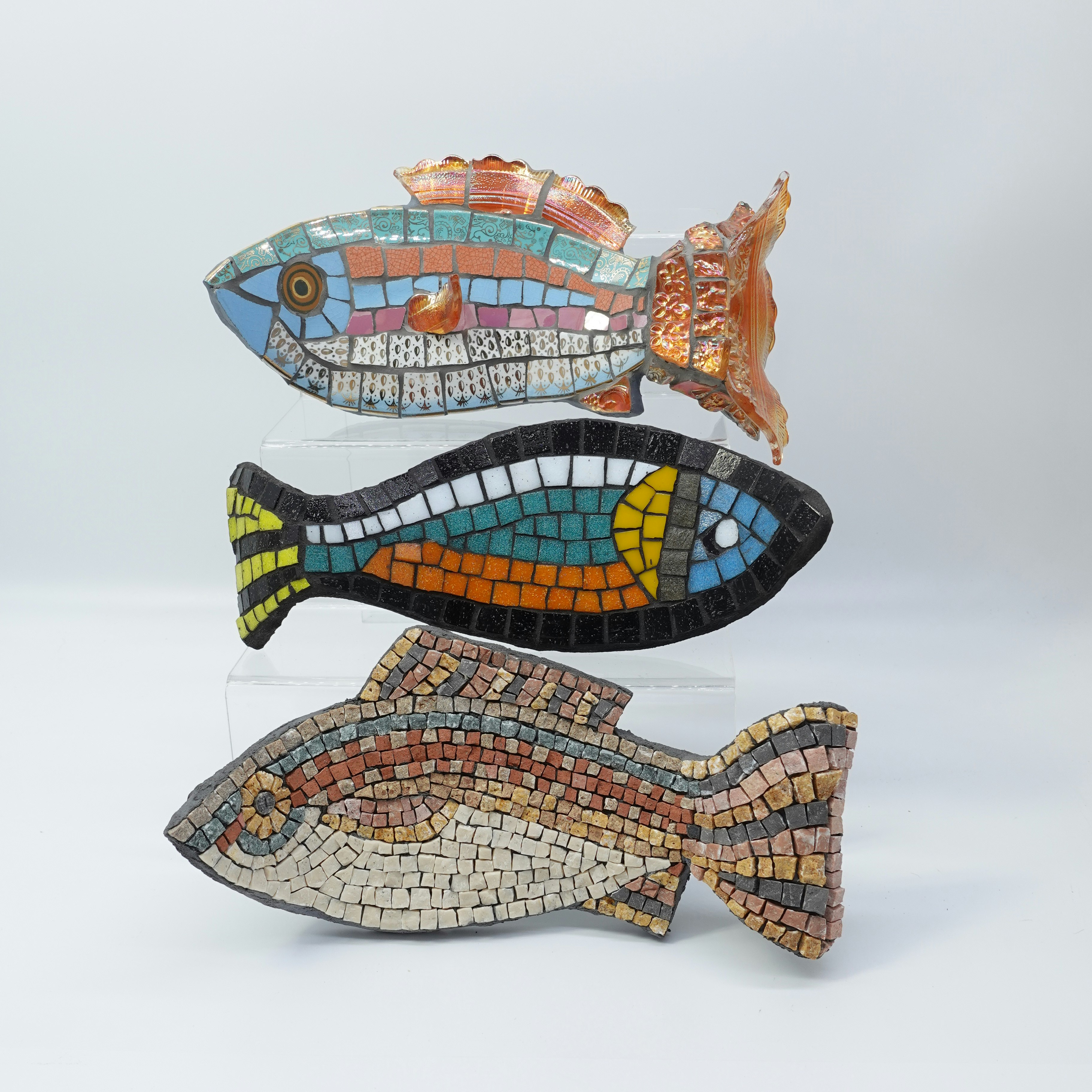 | The three fishes are an exploration into making undulating forms on which to decorate with three contrasting materials and styles. The first fish uses colourful glass tiles, in the style of a Soviet mural mosaic, I love the colours and almost cartoon quality of the finished fish. My second fish is made from marble and the design has ancient Roman as inspiration. The third fish was a playful picassiette style using recycled glassware and china. |