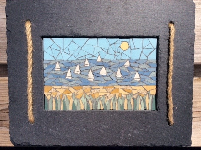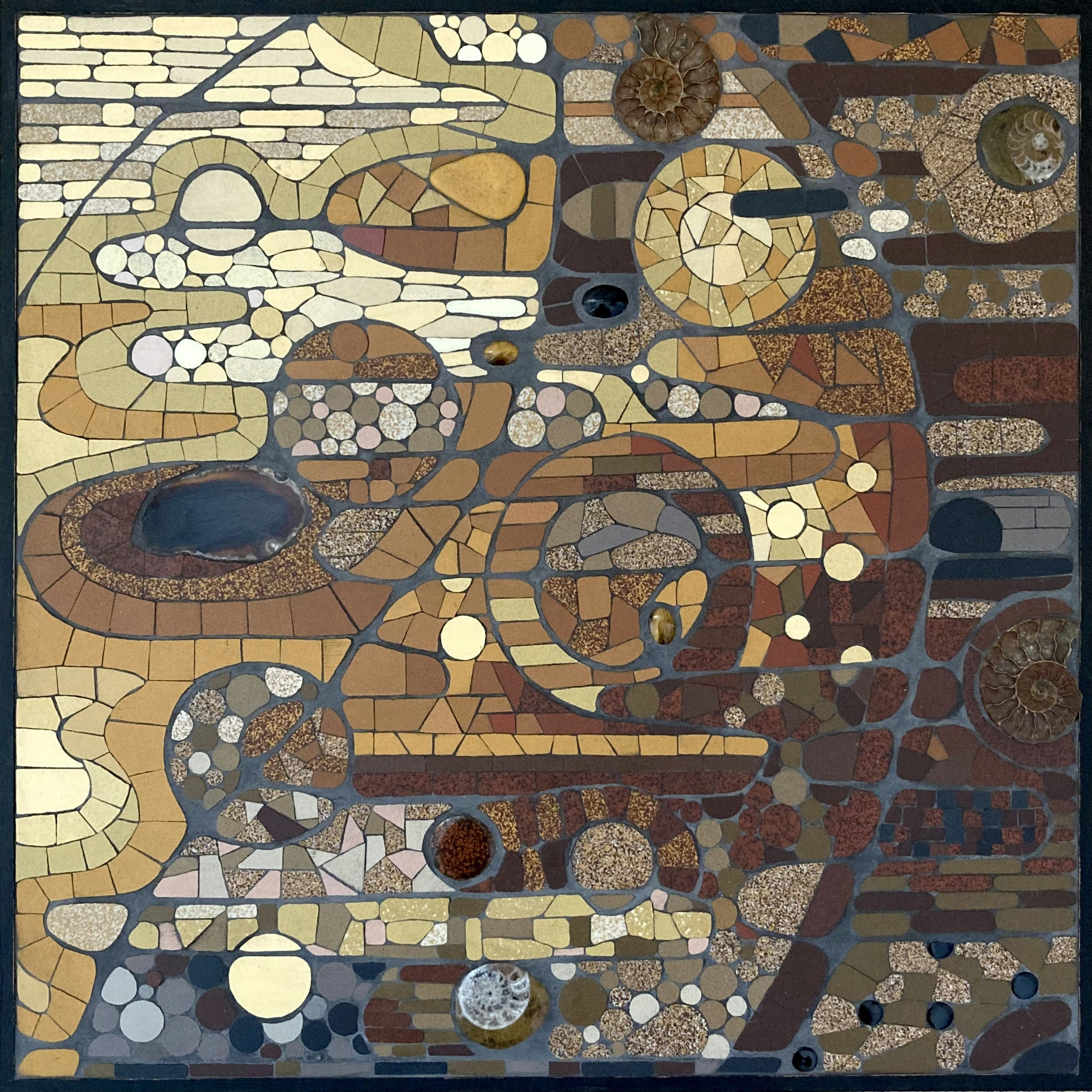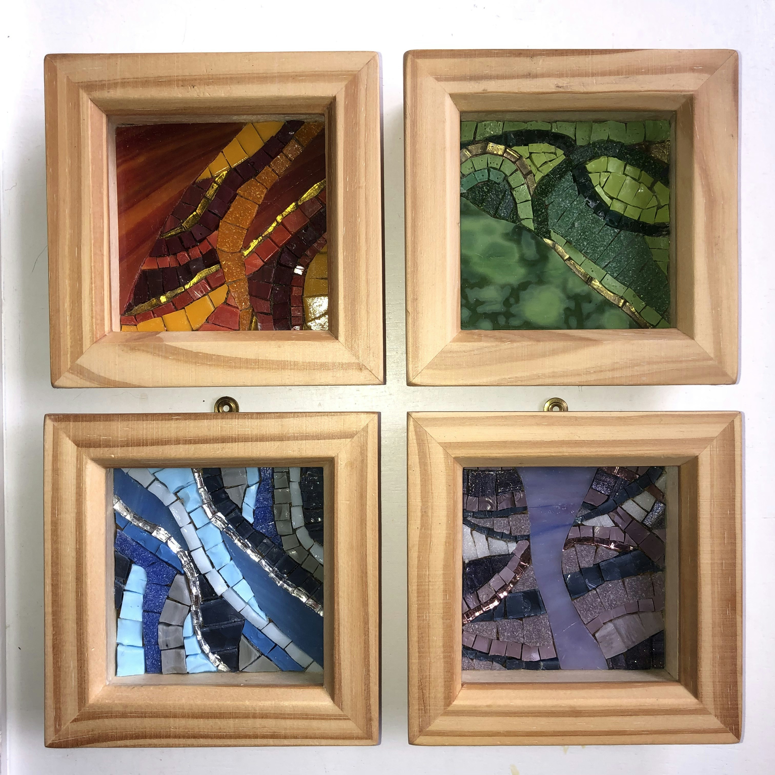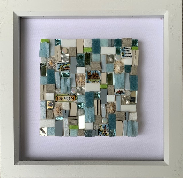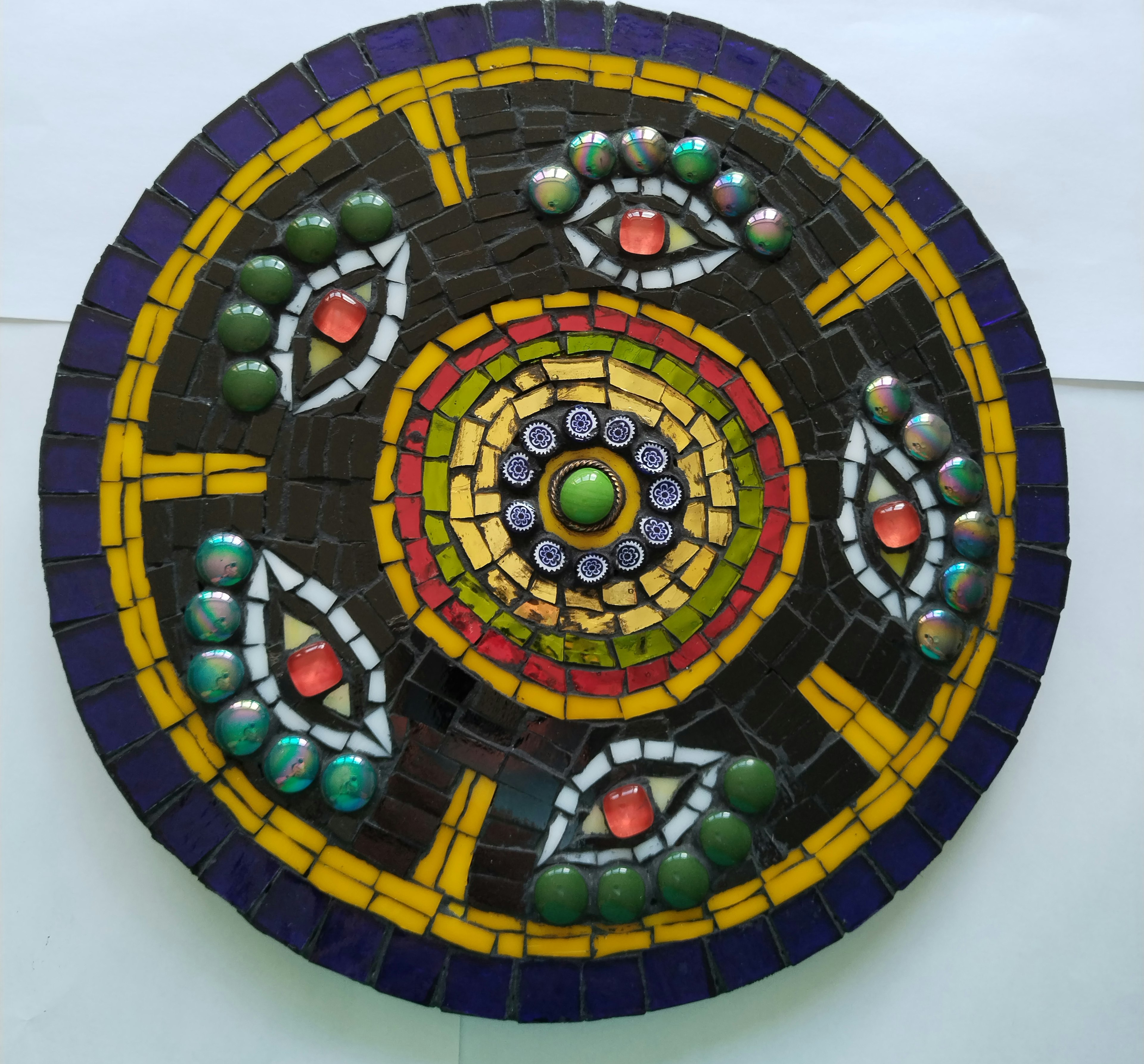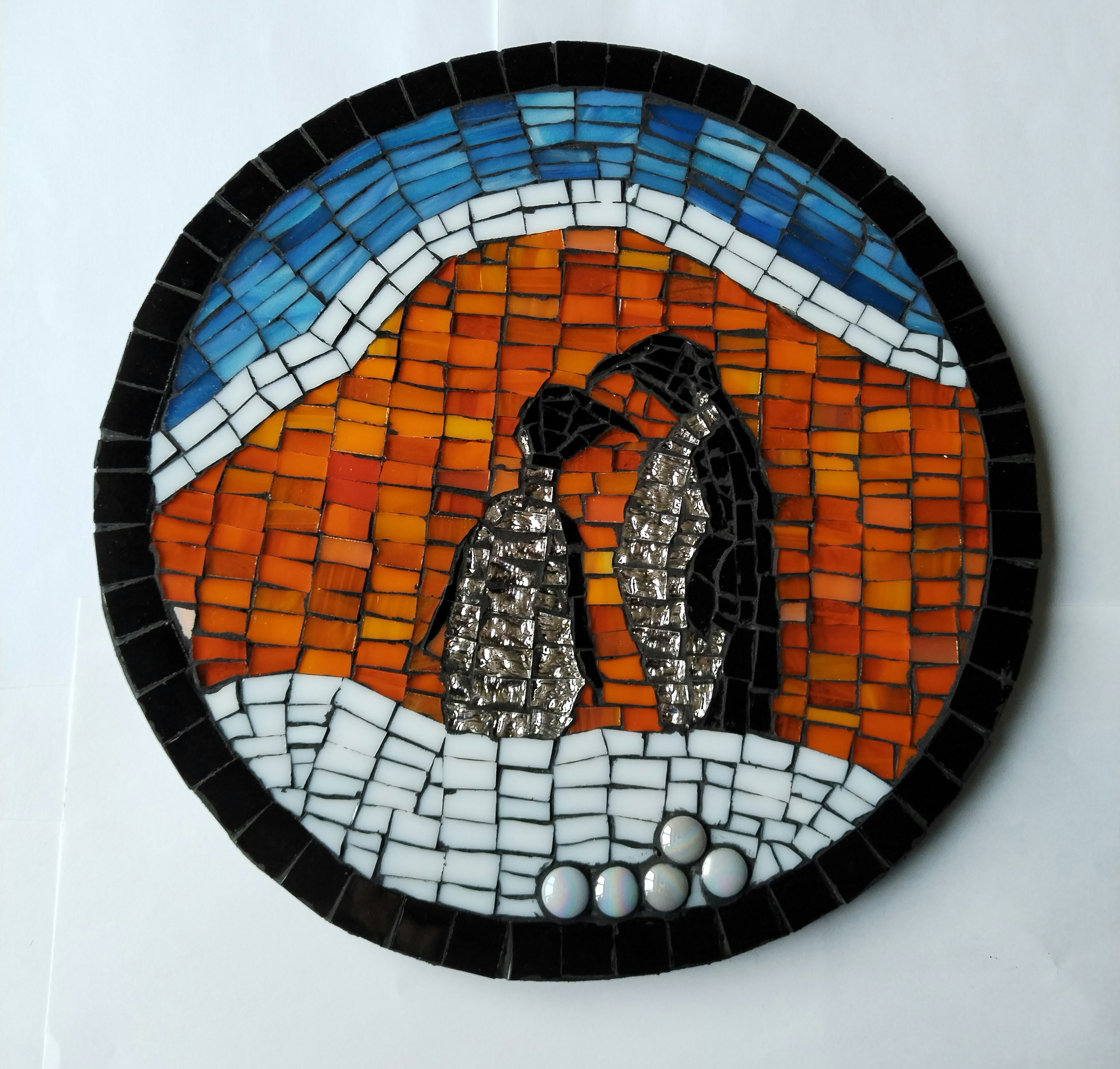 | My mosaics are Nature and Marine based. The penguin pair show them together in their environment depicted by the orange and white stained glass with pearlised nuggets. Their chests in silver granite mirror shine out - a beacon for their future. The 'Eyes' mosaic is an abstract 'look around', with stained glass in yellow, black and blue with iridized nuggets and millefiori as accents and red and green mirror gleaming in the centre. |