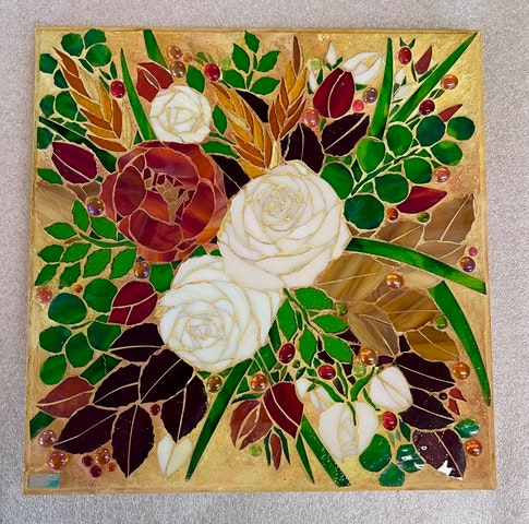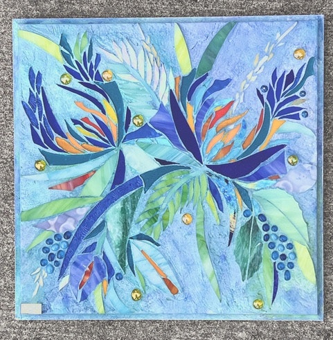 | For these pieces, I have been working in a much smaller format than usual, so I decided not to plan each piece in advance. Instead, I used some favourite pieces of stained glass as a starting point, then employing a 'strem of consciousness' approach to achieve a more spontaneous result. |
