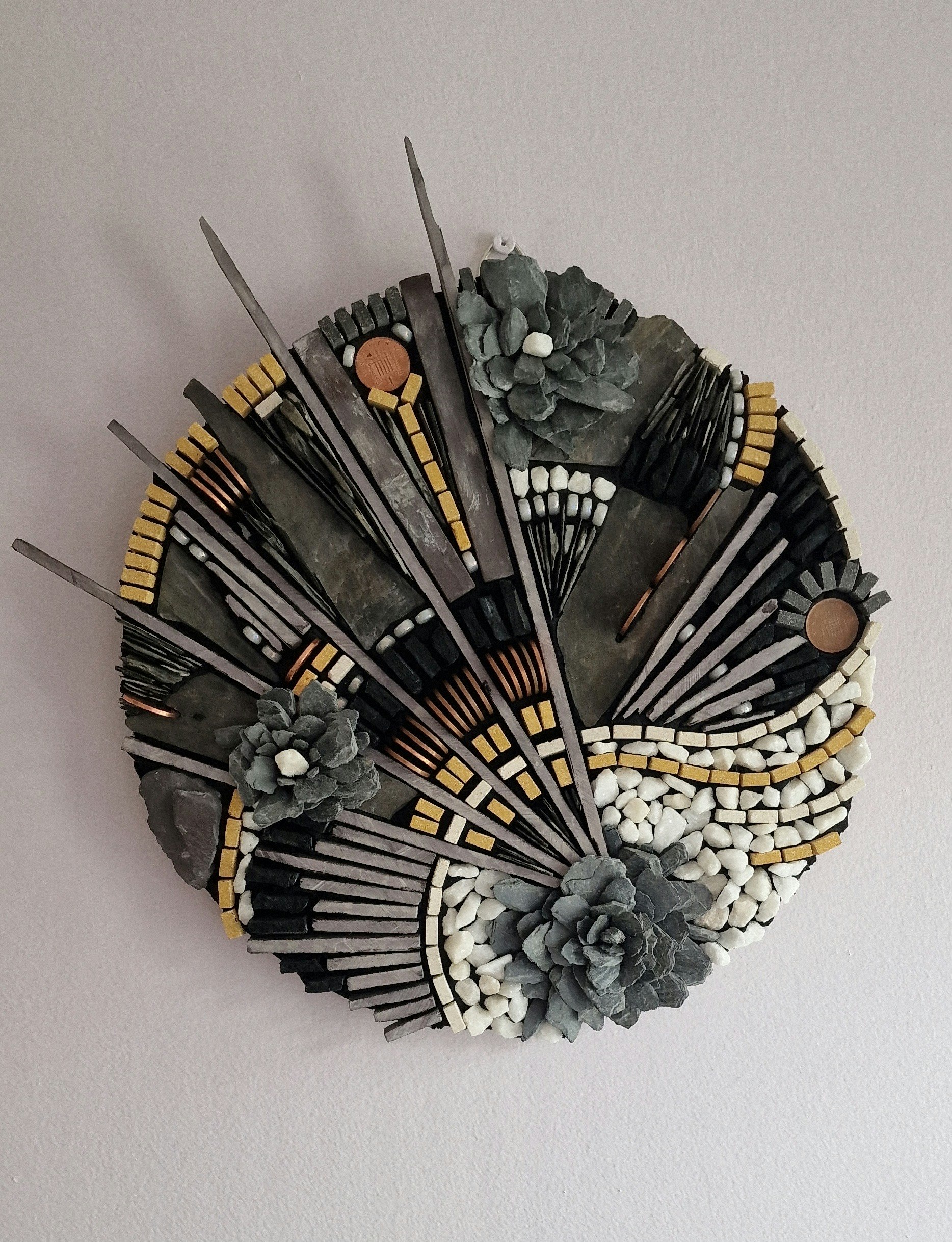 | '25 thoughts' is a representation of my thought process when someone says 'a penny for them'. Incorporating the quick responses of 'sticking out', the slate slices. Regular flowing thought patterns, illustrated in yellow. The flower construction shows growing ideas, whilst everything else has been 'organised' into socially acceptable compartments. |